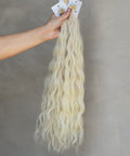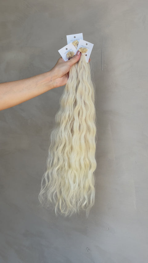 Coloured – Naturally Slavic hair that retains its original, unaltered texture, but has been gently coloured by expert artisans to create specific, in-demand shades while maintaining its premium quality and integrity.